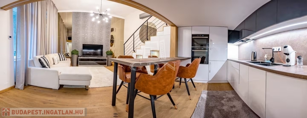 A lakás teljes körű felújításon esett át, ahol a klasszikus és a modern stílus tökéletes egyensúlyban találkozik: