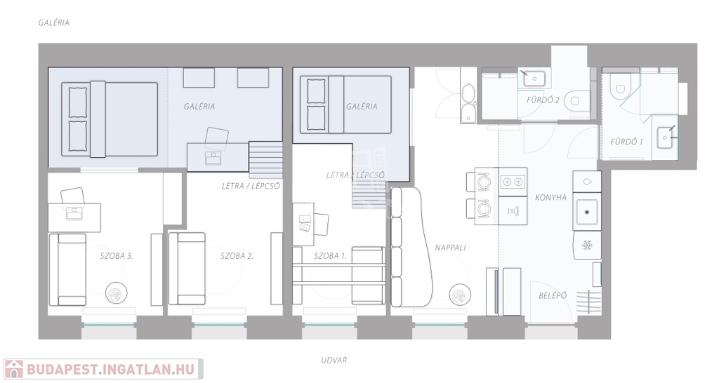 A 2017-ben teljeskörűen, lakberendező közreműködésével felújított, modern, 61 m²-es lakás amerikai konyhás nappalival rendelkezik, mellette három különnyíló, jól használható galériázott hálószoba található (11, 12 és 15 m²), továbbá két fürdőszoba (mindkettő WC-vel, mosdókagylóval és zuhanyzóval felszerelt, az egyikben mosó-szárítógép is van).