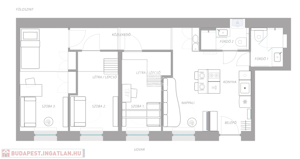 A lakás ablakai a csendes belső udvarra néznek, ahol biciklik tárolása is biztonságosan megoldható. Az ingatlan teljesen gépesített és berendezett: beépített sütő, indukciós főzőlap, mosogatógép, hűtő fagyasztóval, nagy TV több száz csatornával, üvegszálas nagy sebességű internet.