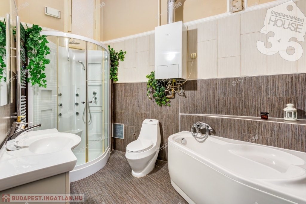 A ház lépcsőháza és homlokzata is gyönyörűen felújított, a lakásban modern fürdőszoba, sarokkád és nagyméretű zuhanyfülke.