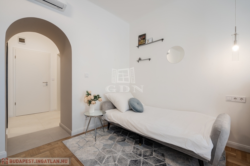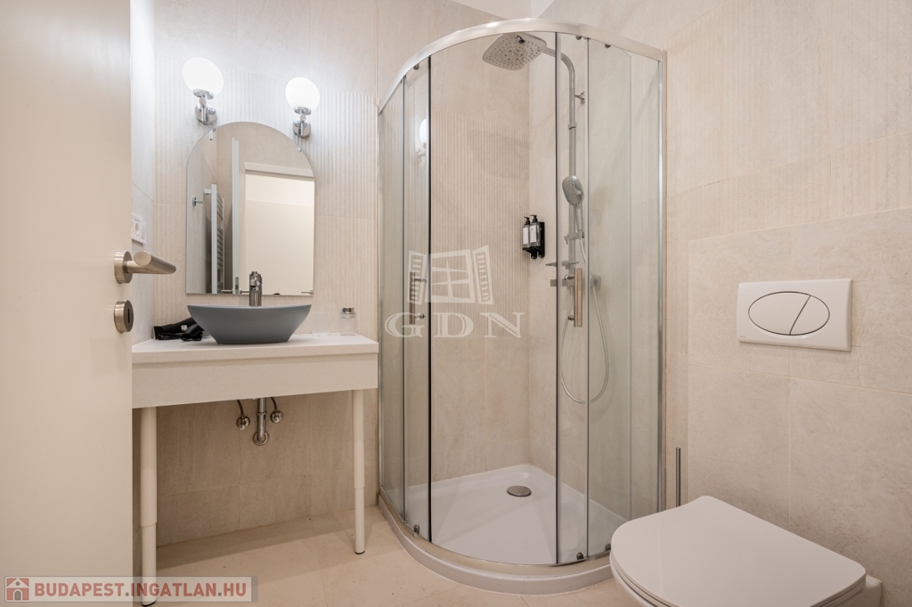 A nettó 64 m²-es lakás két különálló, önálló egységből áll, amelyek mindegyike saját fürdőszobával és konyharésszel rendelkezik. A felújítás néhány éve történt, a helyiségek klimatizáltak, a fűtést elektromos panelek biztosítják. Az ablakok a csendes belső udvarra néznek.