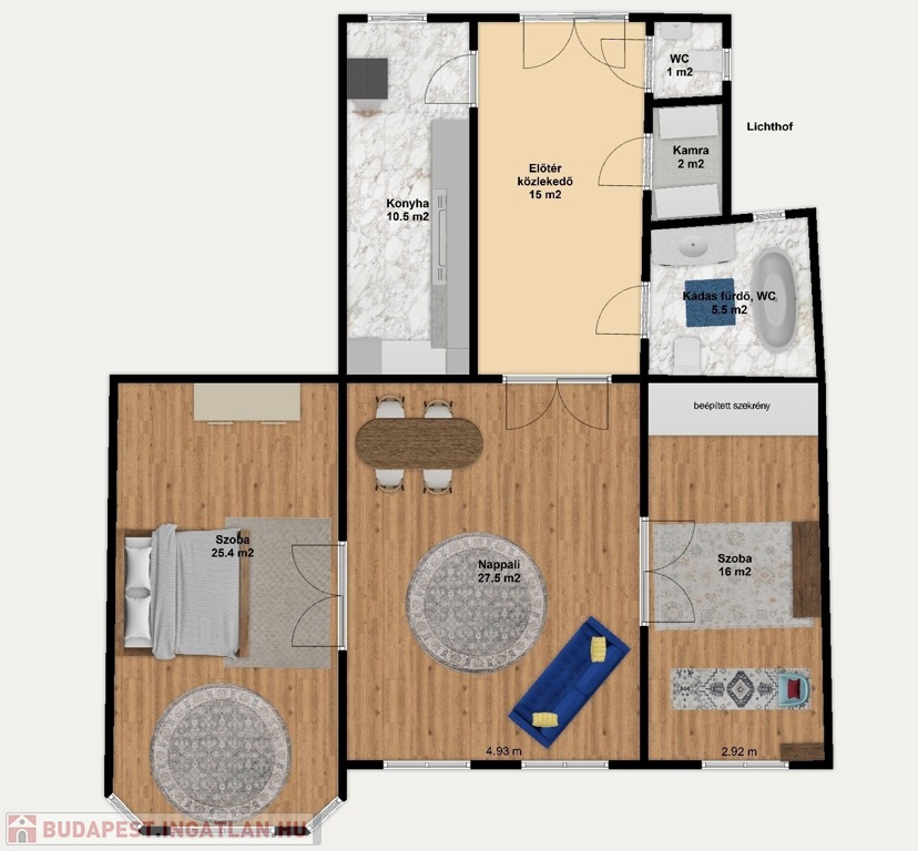 A szobák utcára, a konyha belső udvarra néz, a wc-s fürdő, a külön WC és a kamra pedig lichthofra szellőzik.