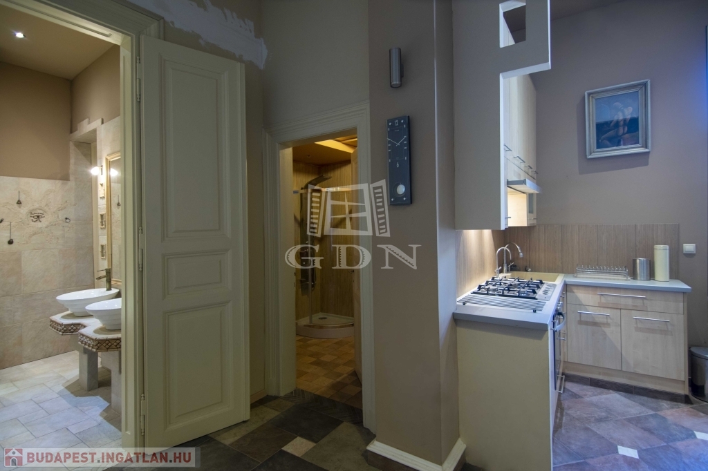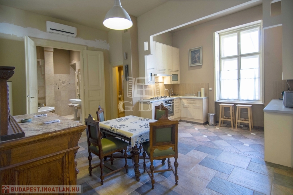 Belvárosban, turisztikailag frekventált helyen, (Blaha Lujza tér közelében) legfelső emeleti, két külön bejáratos lakrésszel rendelkező, napfényes nagypolgári lakás eladó.