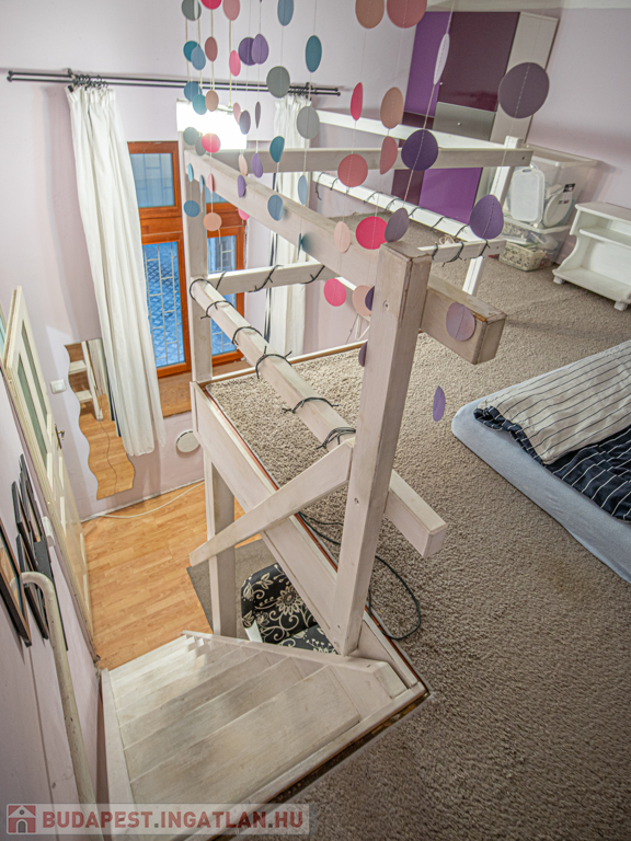 A nagy belmagasságnak köszönhetően egy kb 8nm-es, masszív galéria került kialakításra ami hálószobaként is funkcionál.