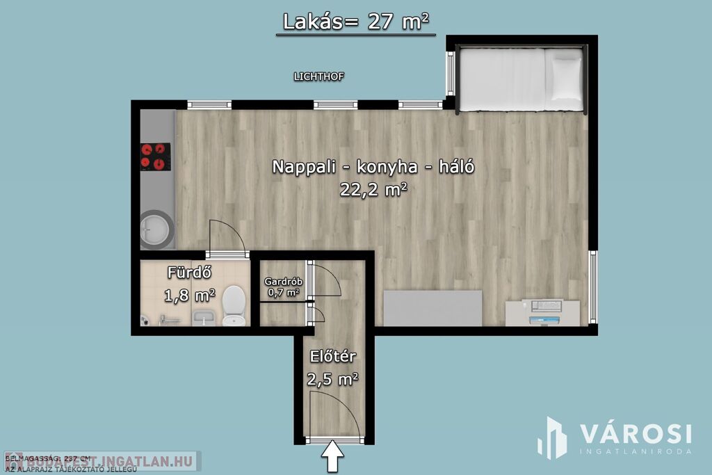 Egy előszobából lépünk a nagyméretű szobába, ami a nappali - konyha -háló funkciót látja el, valamint egy zuhanyzós fürdőszobát találunk még itt.