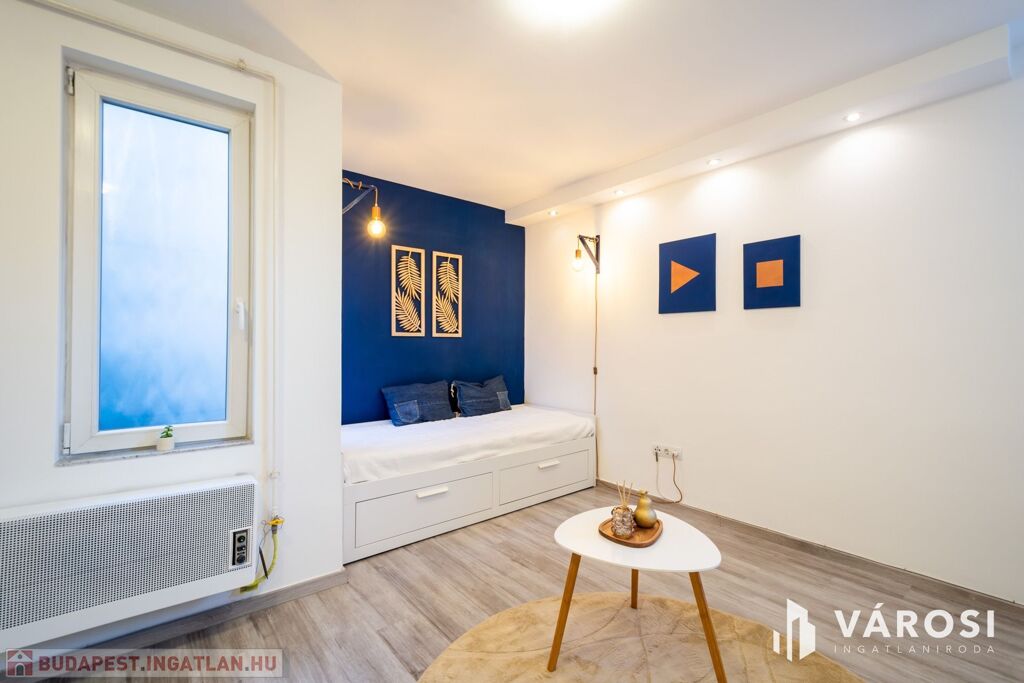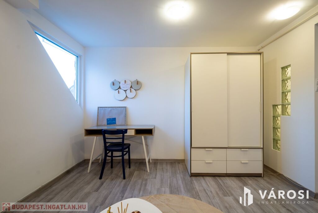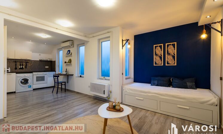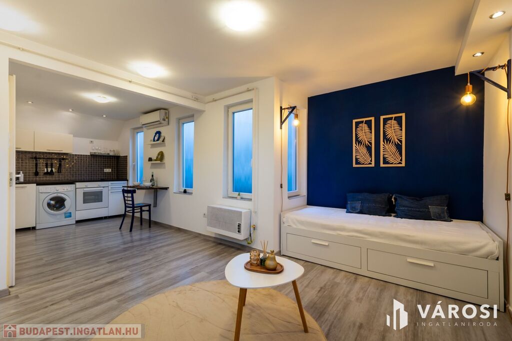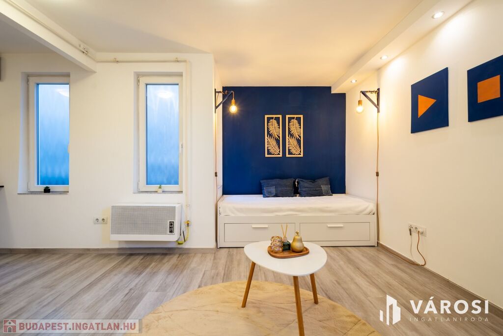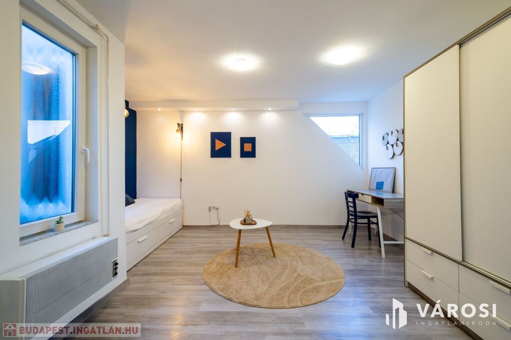 A sok ablaknak köszönhetően rendkívül világos a lakás, fiatalos berendezéssel, és egy garzonhoz képest kifejezetten tágas térrel rendelkezik.