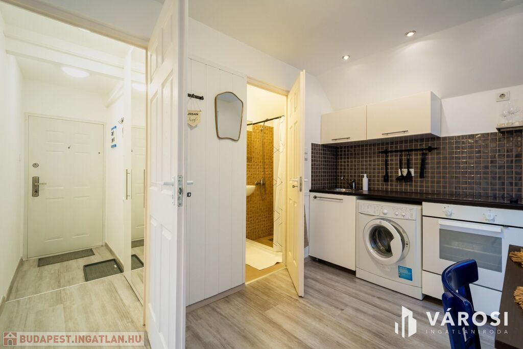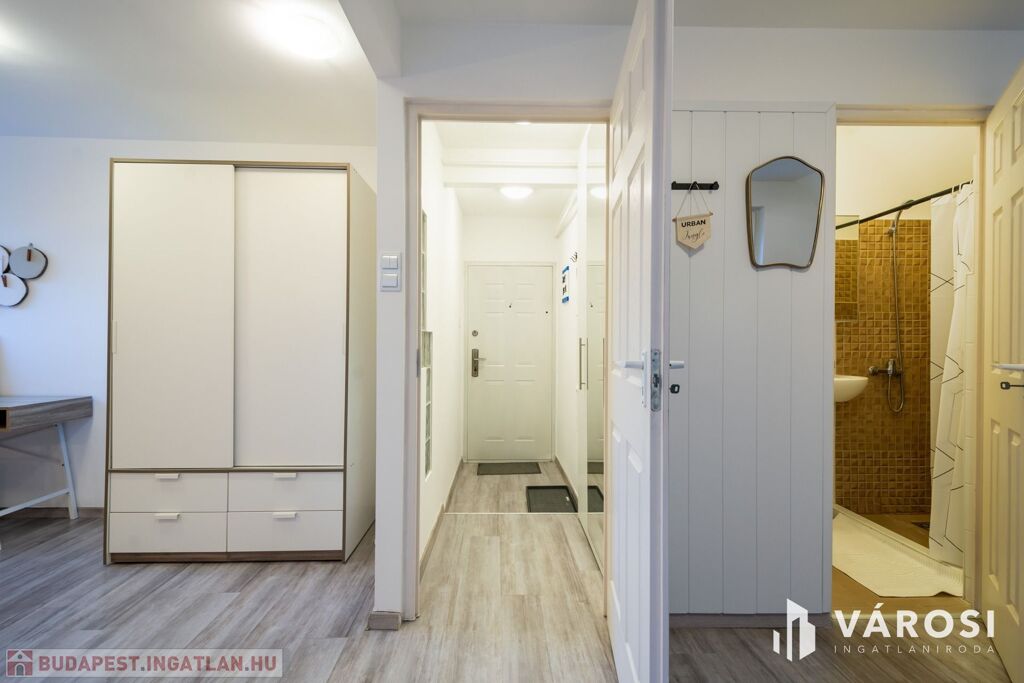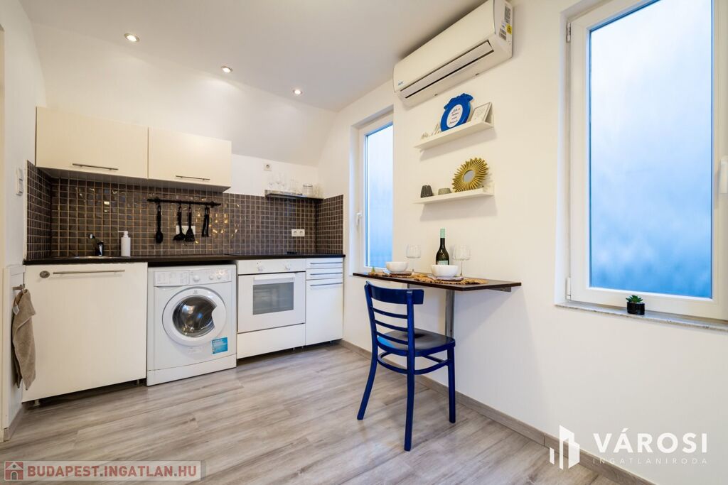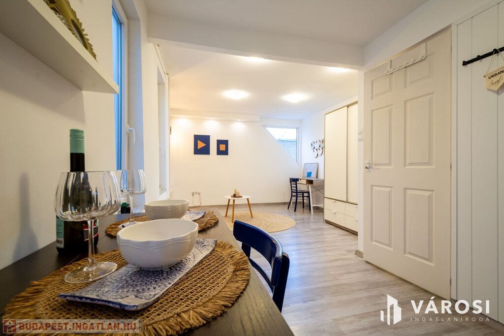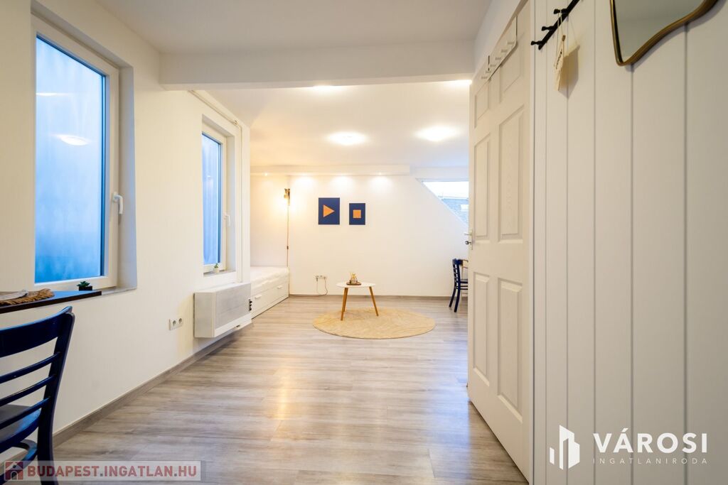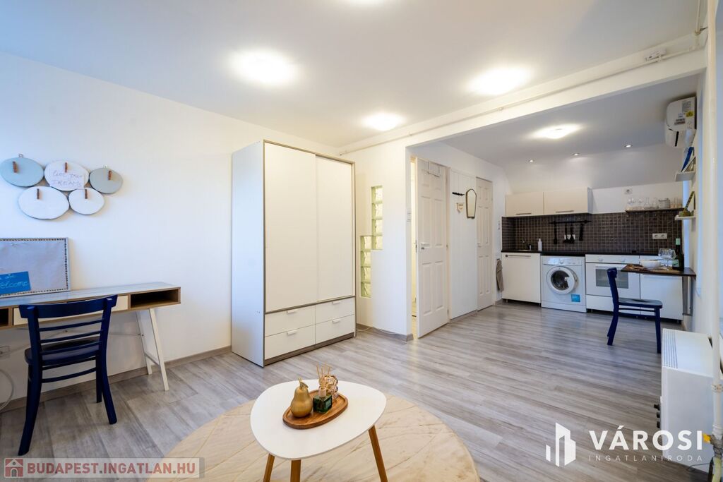 A sok ablaknak köszönhetően rendkívül világos a lakás, fiatalos berendezéssel, és egy garzonhoz képest kifejezetten tágas térrel rendelkezik.