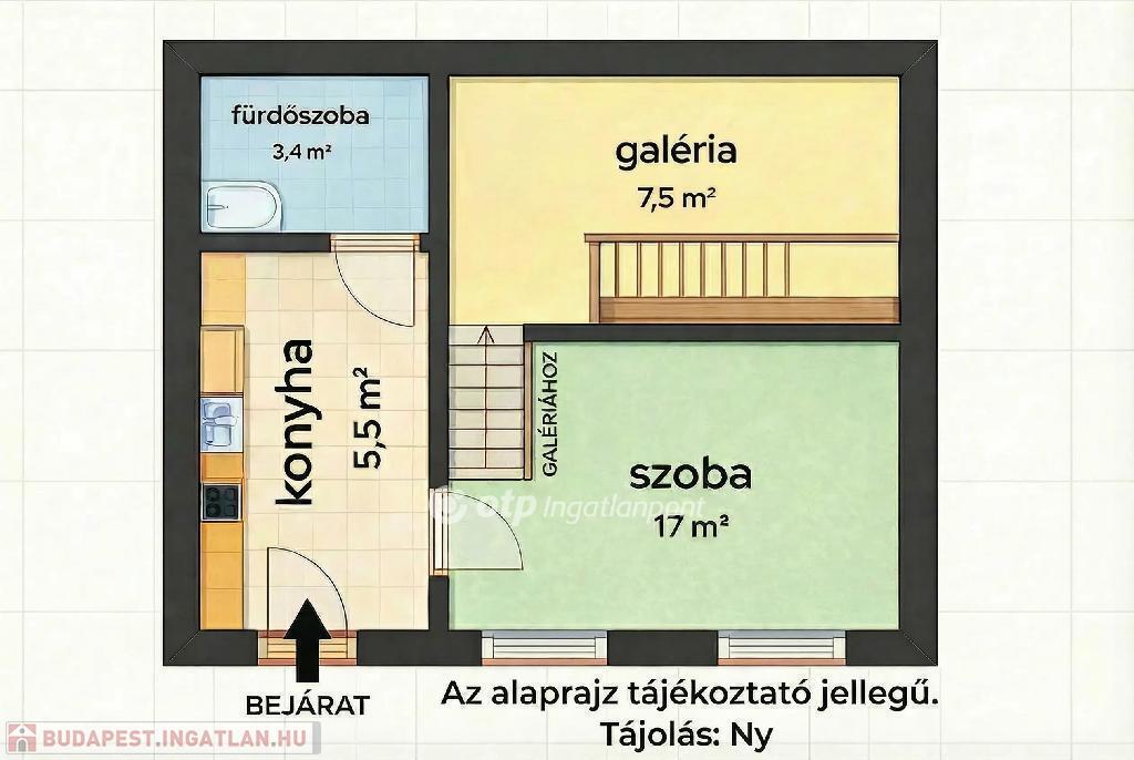 A lakás alapterülete 26 m2, azonban átgondolt belső elosztásának és a galériának köszönhetően a tér kimondottan tágas és jól kihasznált. Az ingatlanban egy szoba található fekvőgalériával, külön konyha, valamint egy fürdőszoba WC-vel.