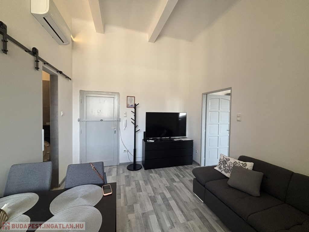 Az ingatlan egy jó állapotú, liftes ház legfelső emeletén helyezkedik el, 46 m2-es, amerikai konyhás nappaliból és egy tágas hálószobából áll. A lakás klímával felszerelt. Az ingatlan néhány évvel ezelőtt lett teljesen felújítva. A vételár a bútorokat és a berendezéseket is tartalmazza.