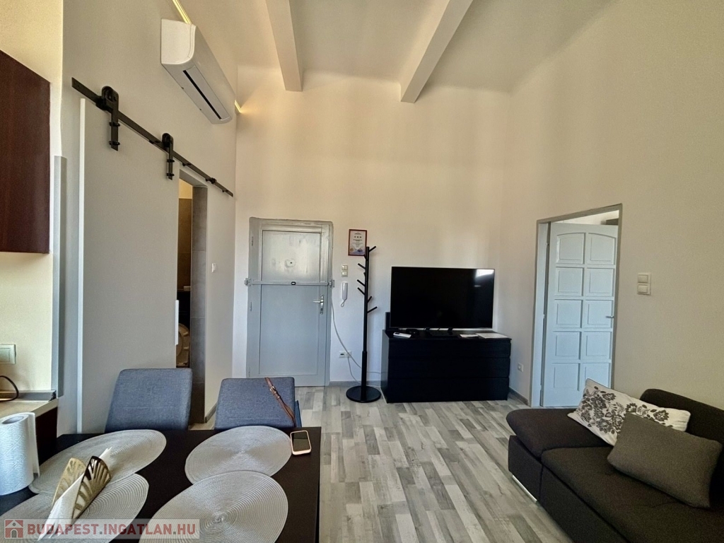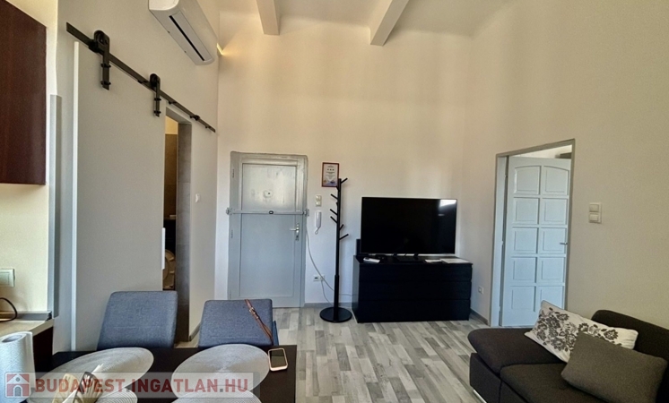Az ingatlan egy jó állapotú, liftes ház legfelső emeletén helyezkedik el, 46 m2-es, amerikai konyhás nappaliból és egy tágas hálószobából áll. A lakás klímával felszerelt. Az ingatlan néhány évvel ezelőtt lett teljesen felújítva. A vételár a bútorokat és a berendezéseket is tartalmazza.