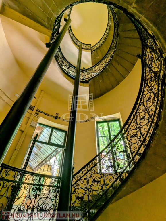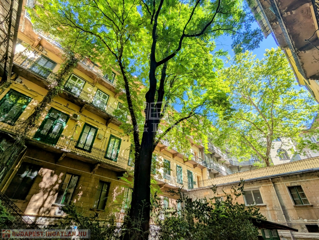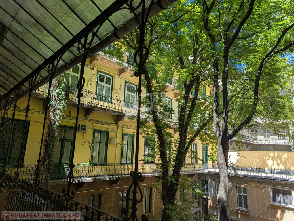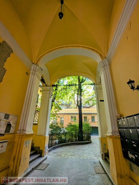 Az ingatlan egy 1880 körül épült, eklektikus-neoklasszicista társasház első emeletén található, vastag falakkal, hatalmas belmagassággal (4,6 méter!), és egyedi, köríves alaprajzi megoldással. A ház tágas, zöld belső udvara hangulatos, fákkal és bokrokkal övezett oázis a város szívében. A jelenlegi tulajdonosnak ritka lehetőségként saját kocsibeálló része is van az udvarban.
