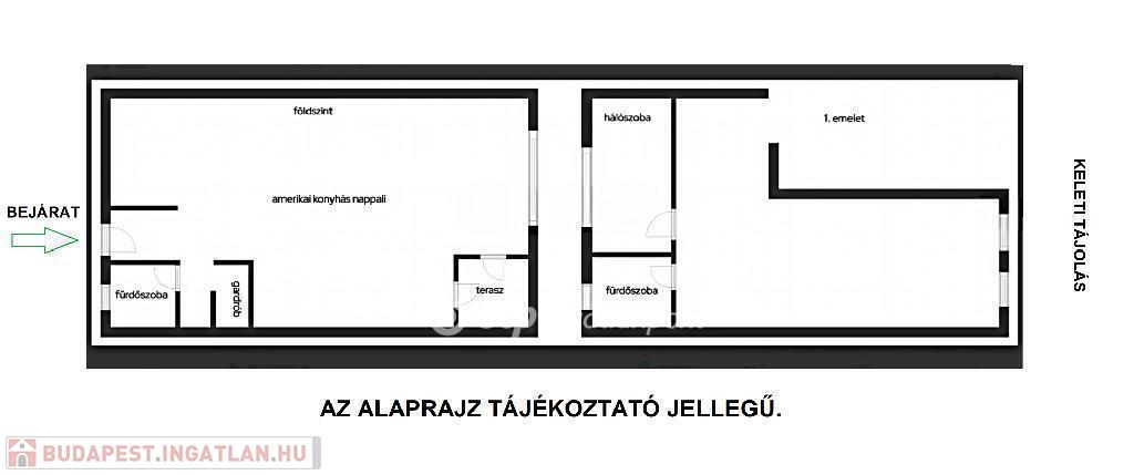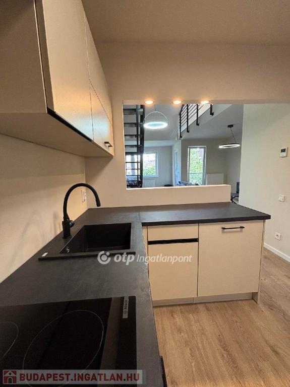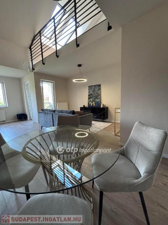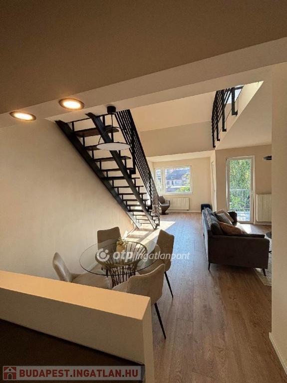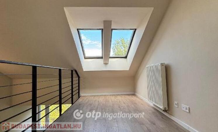A lakás gyakorlatilag egyben van. Hatalmas belmagasság, hatalmas tér. Terasza és amerikai konyhás nappalijának ablaka az udvari fák koronáira néznek. Nincs szükség függönyökre, nem lehet belátni. Keleti fekvése miatt az egész lakás kora délutánig úszik a napfényben, délután a nyugati oldal ablakai miatt világos. A képek kíválóan visszaadják a lakás fiatalos elosztását. A földszinten amerikai konyhás nappali, gardrób, kádas fürdőszoba WC-vel, 4 négyzetméteres terasz van. Az emeleten hálószoba, tusolós fürdőszoba WC-vel, illetve egy nappalinak avagy hálónak használható tér, egy légtérben a földszinttel. A képeken látható bútorok alku tárgyát képezhetik.