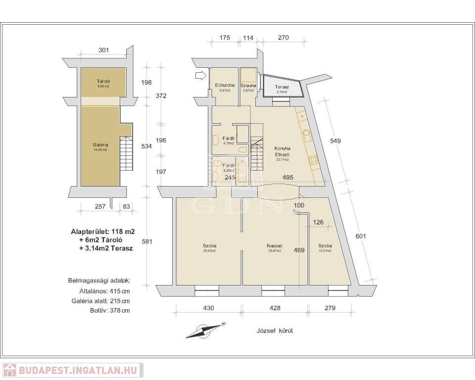 A terekben bővelkedő lakás két külön nyíló hálószobával, nappalival, konyha-étkezővel, álló galériával, két fürdőszobával továbbá tároló helységekkel, illetve tágas előszobával és belső udvarra néző erkéllyel (3,14 m2) rendelkezik.