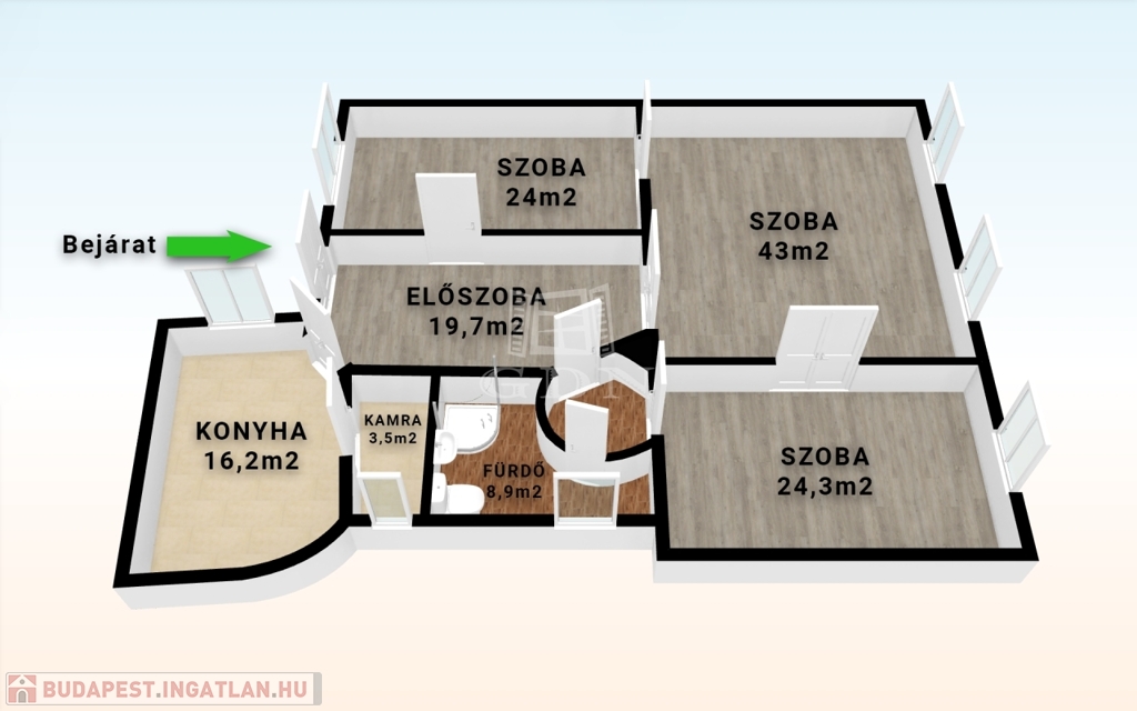 Szobák: 3 nagyméretű szoba