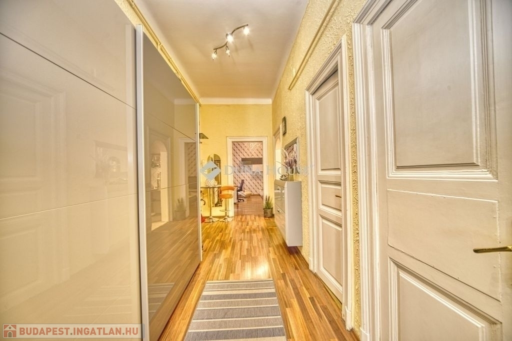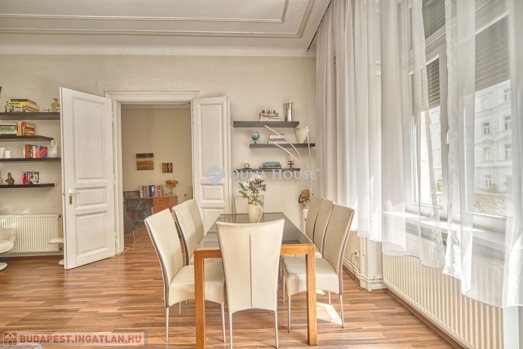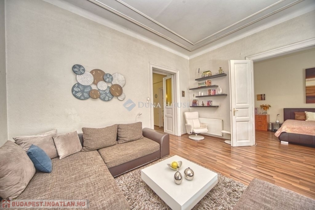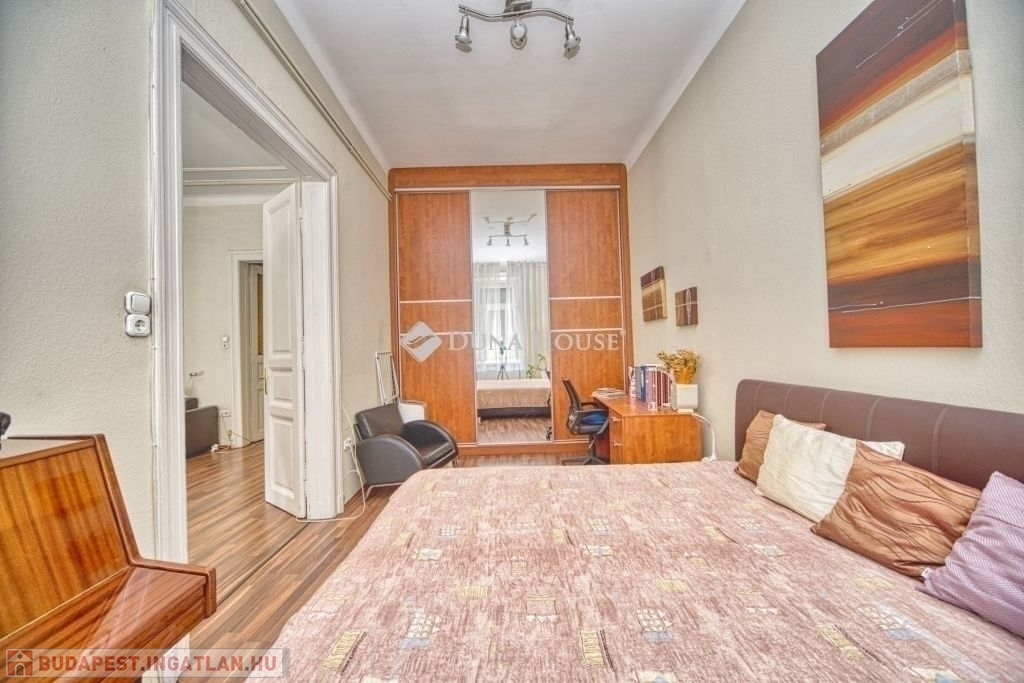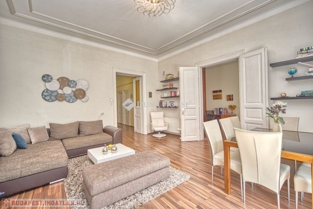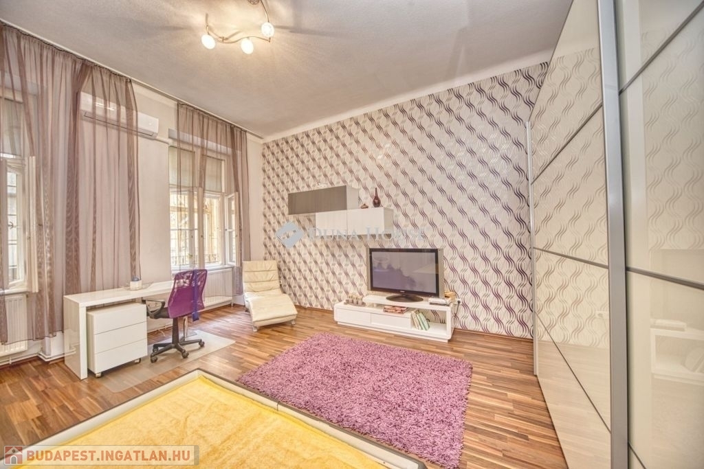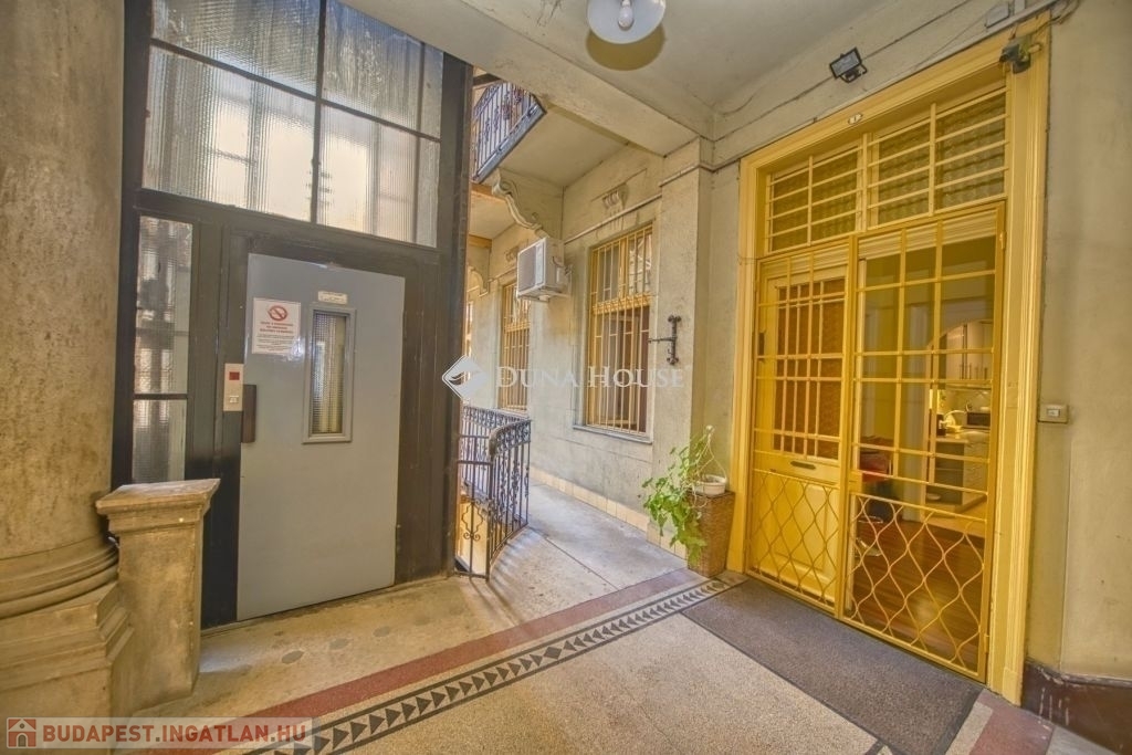 PALOTANEGYEDBEN!Mit ajánlok Önnek? A tökéletes belvárosi élet lehetőségét.A lakás Budapest VIII. kerületében, a Palotanegyedben, egy klasszikus, 1890-es években épült belvárosi épületben található.Az eklektikus stílusban épült társasház első emeletén egyedi adottságokkal rendelkező ingatlant ajánlok a figyelmébe.A környék kulturálisan gazdag és történelmi hangulatú, mely lakó- és üzleti célra is kiváló lehetőségeket kínál.A családi otthon 2015-ben esett át egy teljes felújításon ahogy ezt a képek is tökéletesen tükrözik.Ennek köszönhetően a konyha és a fürdőszoba felújítása megvalósult, a nappali ablaka már műanyag típusú nyílászárók vannak, elektromos redőnnyel ellátva. A hálószobai ablak is korszerű műanyag.A burkolatok újszerűek, a kellemes hőérzetről 2 db klíma gondoskodik.A 31 nm.es nappali a családi élet színtere, sőt erkély kapcsolatos is.A fűtés és a melegvíz ellátás cirkóról történik, a fűtés számla kb. havi 19,000, Ft.A közös költség 29,200, Ft, a lakás rezsije alacsony.A vételárrészét képezi a beépített gépesített konyhabútor, a 2 db klíma, a hálószobai gardrób szekrény, és a két nagyszekrény.Miért jó választás ez a lakás?A 107 m2-nek köszönhetően egy nagyon tágas lakásról beszélünk ennek köszönhetően tökéletes választás lehet családok részére, akár egy irodának is nagyon jól kialakítható az ingatlan.Világos a nagy ablakoknak köszönhetően, érezheti az egész napos természetes napfényt.Kiváló közlekedés néhány perc séta a 2-es metró, a 4-6-os villamos. Budapest bármely pontját, rövid időn belül elérhetjük.A környéken mindent megtalál, amit csak szeretne, éttermek, kávézok, bevásárlóhelyek csupán néhány perc sétára már meg is találhatja, amit szeretne.Ha bármi kérdése merülne fel hívjon fel bátran és szívesen állok rendelkezésére bármilyen kérdése van!Az ingatlan a Palotanegyed minden vonzó gasztronómiai, kulturális lehetőségéhez közel helyezkedik el.Belvárosi elhelyezkedés ellenére a lakás csendes és nyugodt környezetet biztosít. Ne hagyja ki ezt a ritka lehetőséget! Érezze át a tökéletes belvárosi életet hívjon még ma és nézze meg személyesen ezt a különleges lakást.
