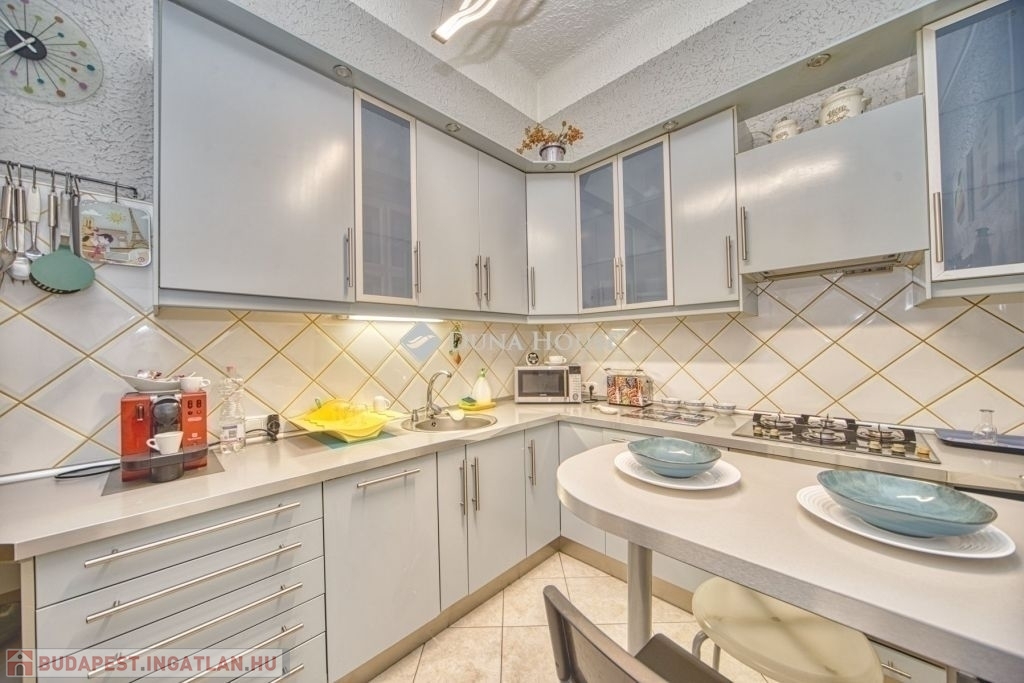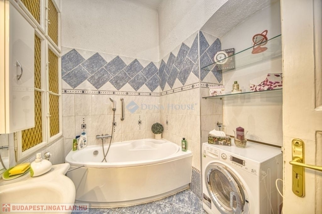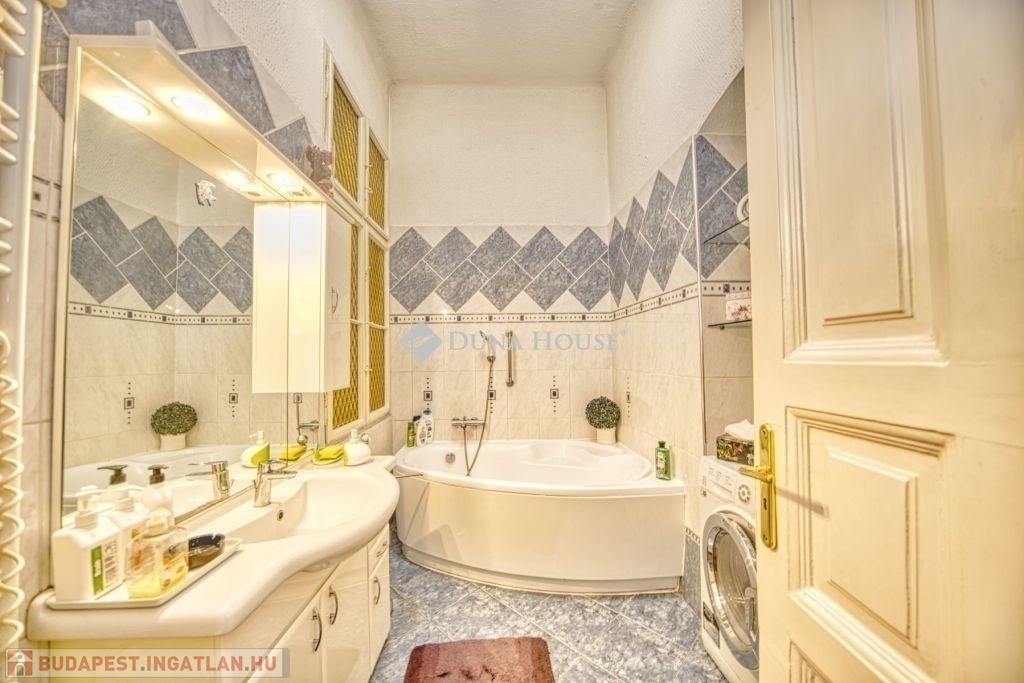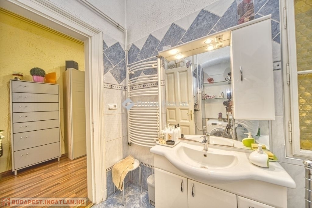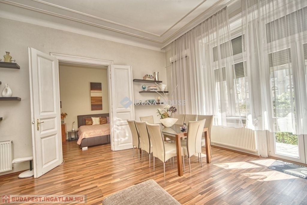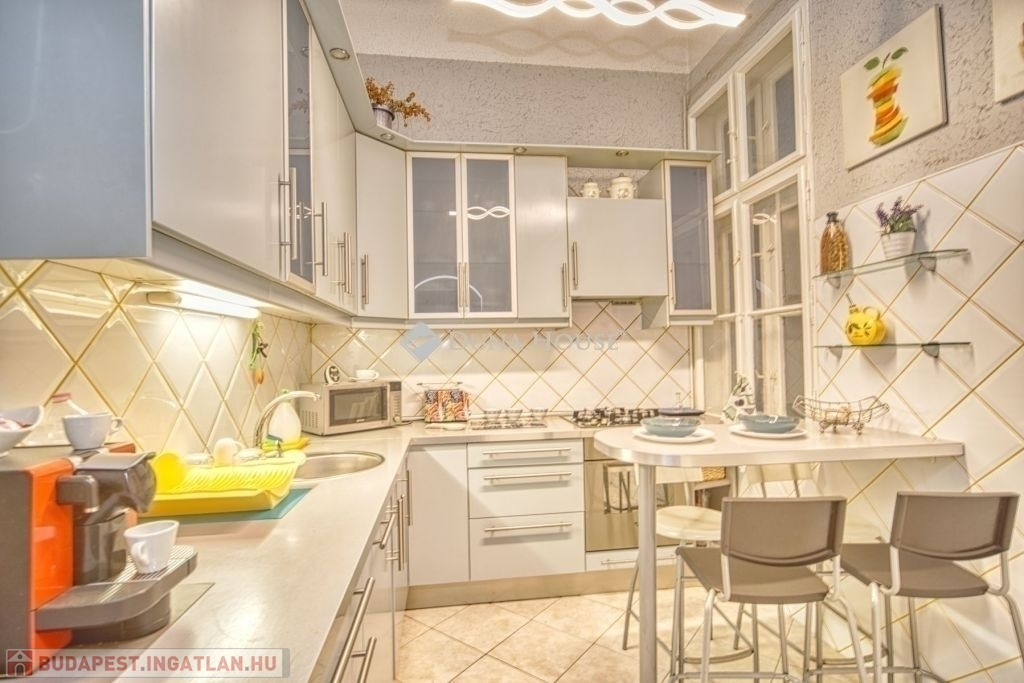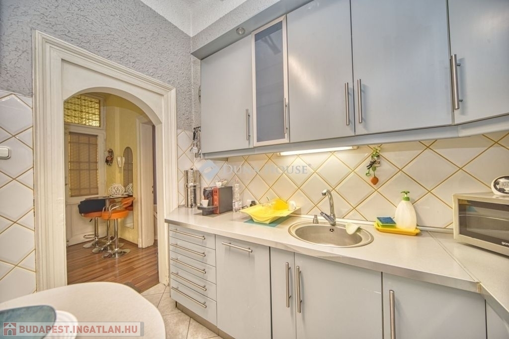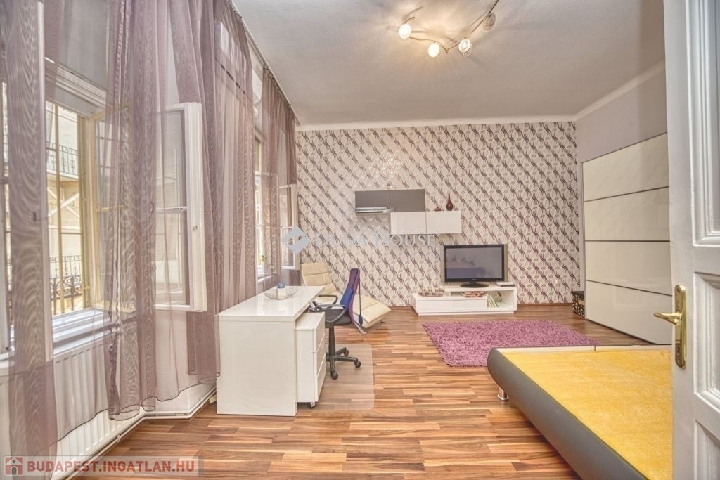 PALOTANEGYEDBEN!Mit ajánlok Önnek? A tökéletes belvárosi élet lehetőségét.A lakás Budapest VIII. kerületében, a Palotanegyedben, egy klasszikus, 1890-es években épült belvárosi épületben található.Az eklektikus stílusban épült társasház első emeletén egyedi adottságokkal rendelkező ingatlant ajánlok a figyelmébe.A környék kulturálisan gazdag és történelmi hangulatú, mely lakó- és üzleti célra is kiváló lehetőségeket kínál.A családi otthon 2015-ben esett át egy teljes felújításon ahogy ezt a képek is tökéletesen tükrözik.Ennek köszönhetően a konyha és a fürdőszoba felújítása megvalósult, a nappali ablaka már műanyag típusú nyílászárók vannak, elektromos redőnnyel ellátva. A hálószobai ablak is korszerű műanyag.A burkolatok újszerűek, a kellemes hőérzetről 2 db klíma gondoskodik.A 31 nm.es nappali a családi élet színtere, sőt erkély kapcsolatos is.A fűtés és a melegvíz ellátás cirkóról történik, a fűtés számla kb. havi 19,000, Ft.A közös költség 29,200, Ft, a lakás rezsije alacsony.A vételárrészét képezi a beépített gépesített konyhabútor, a 2 db klíma, a hálószobai gardrób szekrény, és a két nagyszekrény.Miért jó választás ez a lakás?A 107 m2-nek köszönhetően egy nagyon tágas lakásról beszélünk ennek köszönhetően tökéletes választás lehet családok részére, akár egy irodának is nagyon jól kialakítható az ingatlan.Világos a nagy ablakoknak köszönhetően, érezheti az egész napos természetes napfényt.Kiváló közlekedés néhány perc séta a 2-es metró, a 4-6-os villamos. Budapest bármely pontját, rövid időn belül elérhetjük.A környéken mindent megtalál, amit csak szeretne, éttermek, kávézok, bevásárlóhelyek csupán néhány perc sétára már meg is találhatja, amit szeretne.Ha bármi kérdése merülne fel hívjon fel bátran és szívesen állok rendelkezésére bármilyen kérdése van!Az ingatlan a Palotanegyed minden vonzó gasztronómiai, kulturális lehetőségéhez közel helyezkedik el.Belvárosi elhelyezkedés ellenére a lakás csendes és nyugodt környezetet biztosít. Ne hagyja ki ezt a ritka lehetőséget! Érezze át a tökéletes belvárosi életet hívjon még ma és nézze meg személyesen ezt a különleges lakást.