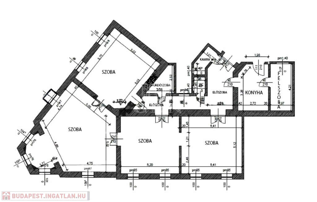 • Tágas helyiségek: az ingatlan négy impozáns méretű szobából (45 m², 30 m², 26 m², 27 m²) és egy 8 m²-es félszoba-méretű helyiségből áll, kiegészülve egy udvari nézetű konyha-étkezővel.