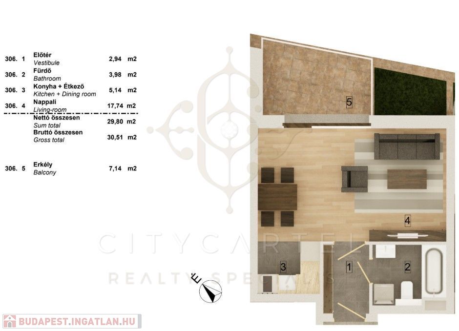 A liftes társasház 3. emeletén található, 30,51 nm-es, (29,8 nm lakás 7,14 nm terasszal) 1 szobás lakás korszerű hőszivattyús fűtés–hűtéssel és teljes körű okosotthon-rendszerrel felszerelve várja új tulajdonosát. A burkolatok még választhatók, így a leendő tulajdonos saját ízlésére szabhatja az ingatlant.