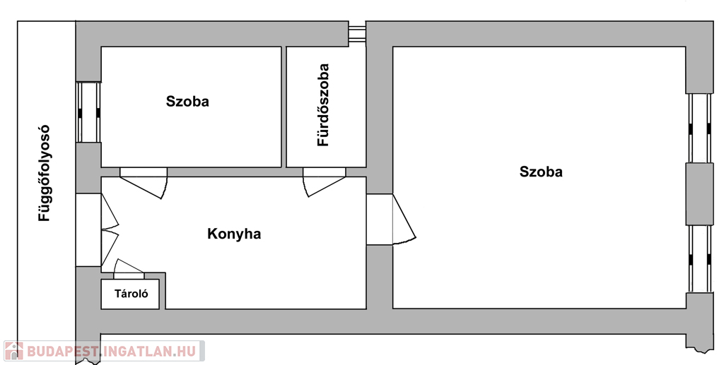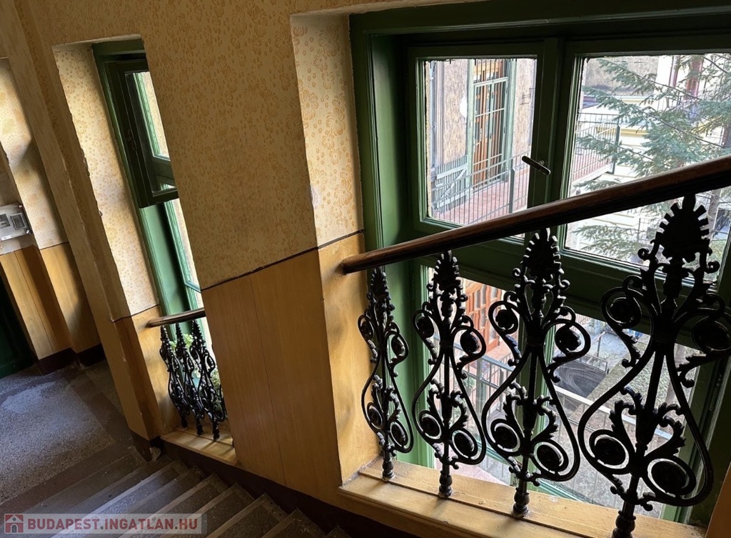 A lakás két külön nyíló szobás, elrendezése jól alakítható, a nagy belmagasság pedig galéria kialakítására is lehetőséget ad. A belvárosi elhelyezkedés ellenére kifejezetten csendes: a kisebbik szoba egy zöld, fás udvarra néz. A körfolyosó itt véget ér, így nincs átjárás a lakás előtt – ez ritka nyugalmat biztosít, és akár egy kis balkonkert kialakítására is alkalmas. Az ingatlan a második emeleten található, az épületben nincs lift.