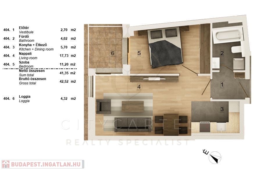 A liftes társasház 4. emeletén található, 43,55 nm-es, (41,36 nm lakás 4,37 nm loggiával) 2 szobás lakás korszerű hőszivattyús fűtés–hűtéssel és teljes körű okosotthon-rendszerrel felszerelve várja új tulajdonosát. A burkolatok még választhatók, így a leendő tulajdonos saját ízlésére szabhatja az ingatlant.