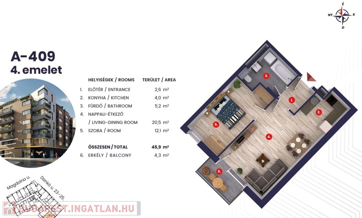 A 46 m2 alapterület és a 1,5 szobás elrendezés optimálisan kihasználható életteret biztosít.