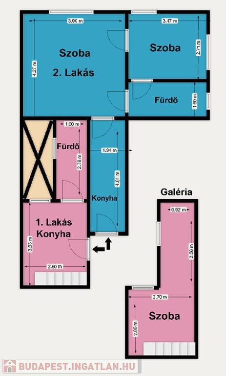A lakás jelenlegi elosztása rendkívül praktikus: három külön nyíló hálószoba, két fürdőszoba, utcai és udvari nézetű ablakokkal. A 405 cm-es belmagasság lehetővé tette egy galéria kialakítását, ami tovább növeli a hasznos teret.