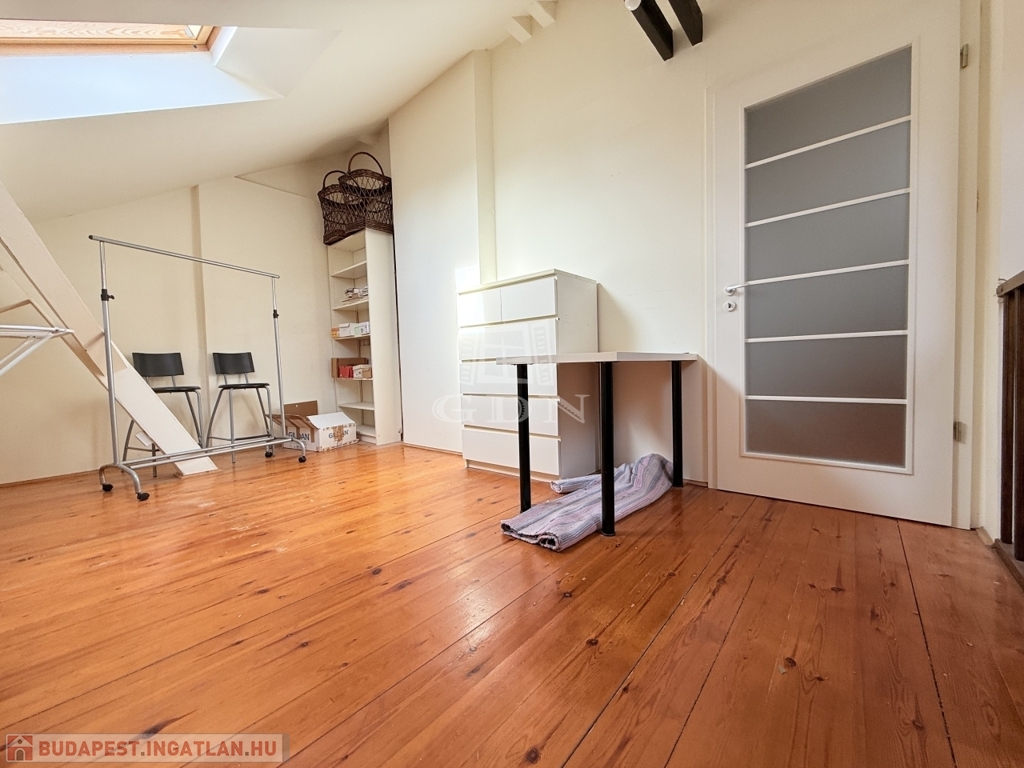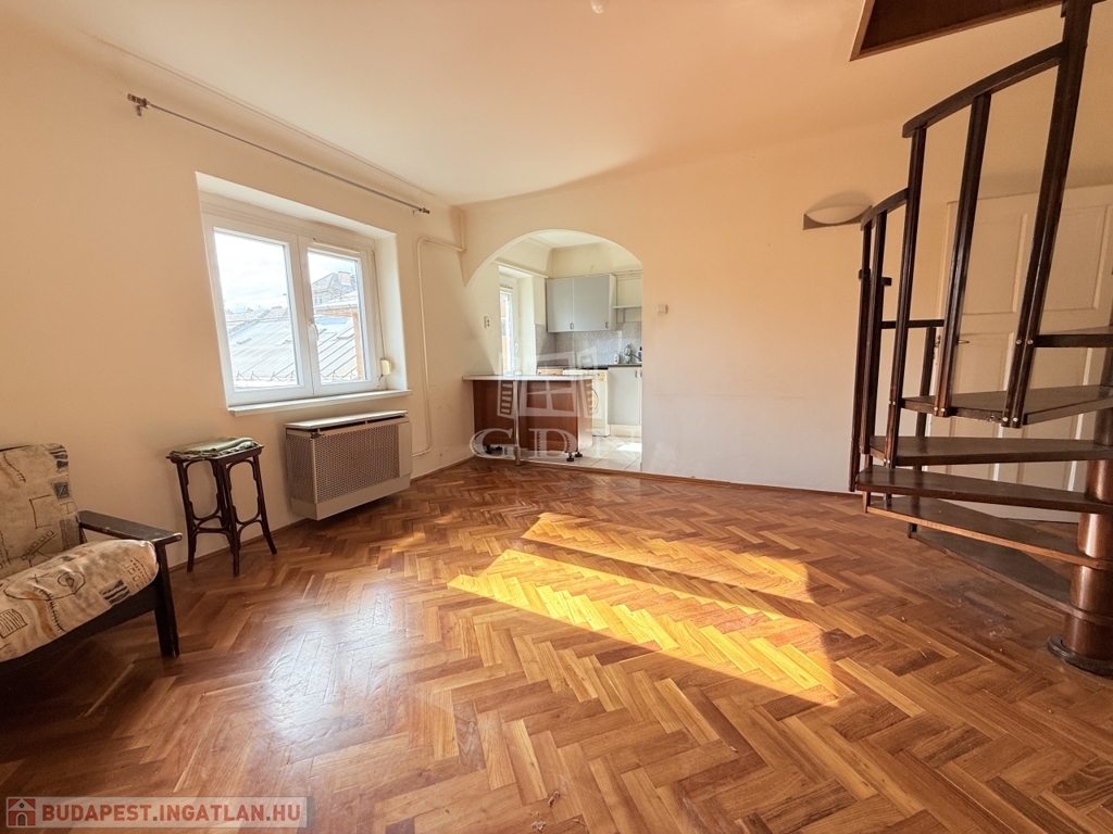 Titkos favorit a zavaros ingatlanpiac sokaságában, Zugló és Józsefváros határán a Puskás aréna mellett kiemelkedő infrastruktúrával. Ha szeretne központi elhelyezkedéssel egy kiváló, lakható, de akár könnyen bérbeadható társasházi lakást megfizethető áron akkor érdemes ezt az ingatlant személyesen is felfedeznie. Csupán 4 megállónyira (7perc metró) a Deák Ferenc tértől, Stadionok metró megállótól séta távolságban, madárcsicsergős, zöld és békés környezetben Stróbl Alajos utcában található az ingatlan. Elkerített zárt kertben áll az a 6 lakásos lépcsőház melyben a legfelső, második emeleten helyezkedik el ez a különleges, sallangoktól mentes duplex lakás. Az összes ablaka a csendes belső kert irányába néz és napkeltétől napnyugtáig világos, fényárban úszik. Az épület rendezett, a tetőt 10 éve újították fel új cserépfedést kapott, egyidejűleg velux ablakok kerültek beépítésre a felső szinten és az alsó szinten is műanyag ablakok váltották a fa nyílászárókat. Az alsó szinten az előszobából nyílik az összes helyiség, egy tágas háló, mellette egy praktikus kamra /dolgozó ablakkat és a fürő illetve a külön wc kapott helyet a konyha nappali mellett. A konyha – étkező és nappali jelenleg egy egység, de az ablakok elhelyezkedésének köszönhetően akár újra külön választhatóak. A nappaliból vezet fel egy csigalépcső, ahol további két hálószoba (ablakokkal)található, igény esetén a felső szint is alkalmas egy zuhanyzó és mosdó elhelyezésére. Az alső rész 47m2 a felső pedig bruttó 56m2 , a földhivatali nyilvántartás szerint 77m2, az értékesítési alapterületkén a 190cm alatti területet a szokásos 50%-kal került feltüntetésre. Fűtését tekintve jelenleg gázkonvektor, ami akár egy mika kazánra is cserélhető. Igény esetén a fűtés hőszivattyús klímákkal is megoldható opcionálisan H tarifával párosítva. A lakást immár 6 évig bérlő lakta, azonnal birtokba vehető az ingatlan. A környéken minden megtalálható, ami városi mindennapok kényelméhez elengedhetetlenek. Könnyen parkolhatóak a környező utcák, kiváló tömegközlekedési lehetőségek állnak rendelkezésre. Az aréna pláza csupán 900m távolságra. Tökéletes lehet akár nagyobb családok részére, de bérbeadás is korrekt hozamot hoz a stabil ingatlan ár növekedés mellett így magas inflációs környezetben értékálló befektetés.