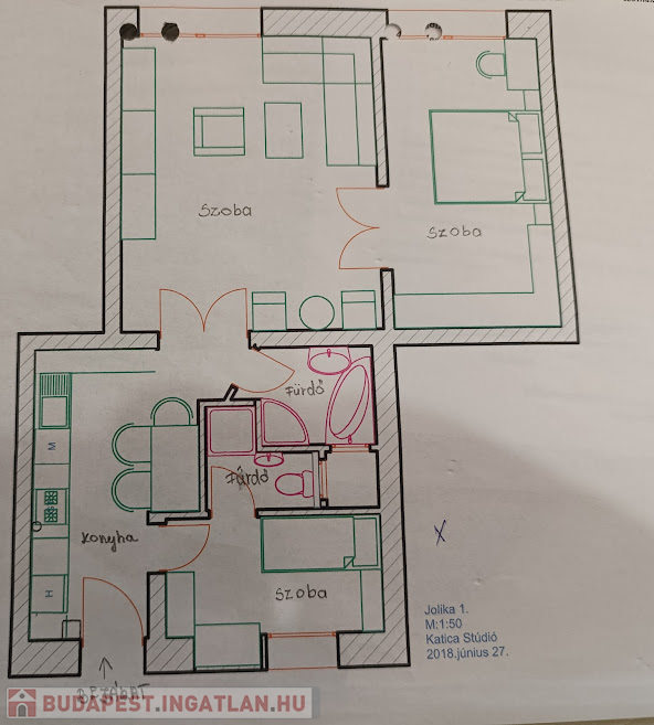 A lakásba belépve egy igényesen felújított, gépesített konyha/étkező található. A konyhából bal kéz felől egy szoba található, ahonnan nyílik a 2024-ben készült fürdő és Wc. A konyha másik oldalán található egy külön nyíló, felújított újabb Fürdő-wc. A meleg vizet villanybojler biztosítja. Az ingatlanhoz tartozik továbbá két egymásba nyíló, de csukható szoba. A méreteik 27m2 és 17 m2. Az ingatlan hirdetéshez alaprajz tartozik. A szobákba fa a konyhába pedig műanyag nyílászárok taláhatóak.