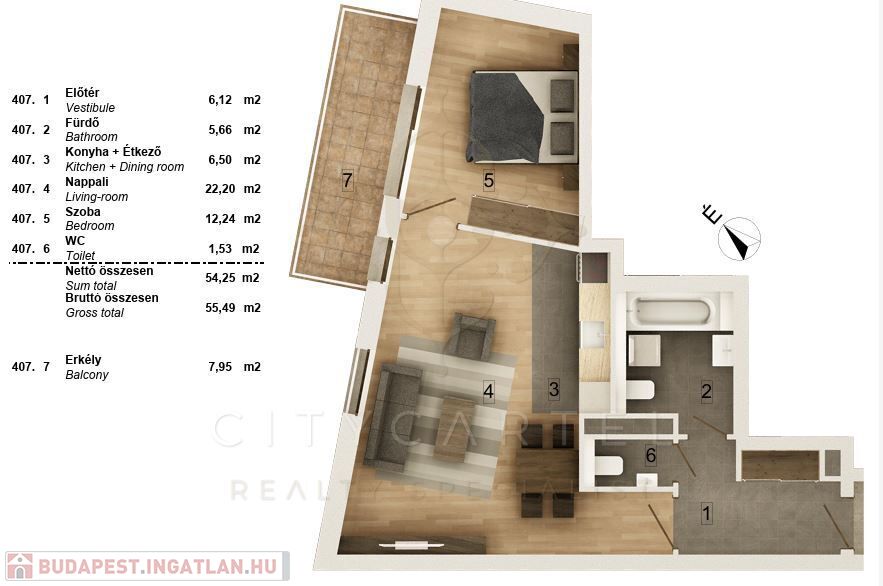 A liftes társasház 4. emeletén található, 5,49 nm-es, (54,25 nm lakás 7,95 nm terasszal) 2 szobás lakás korszerű hőszivattyús fűtés–hűtéssel és teljes körű okosotthon-rendszerrel felszerelve várja új tulajdonosát. A burkolatok még választhatók, így a leendő tulajdonos saját ízlésére szabhatja az ingatlant.