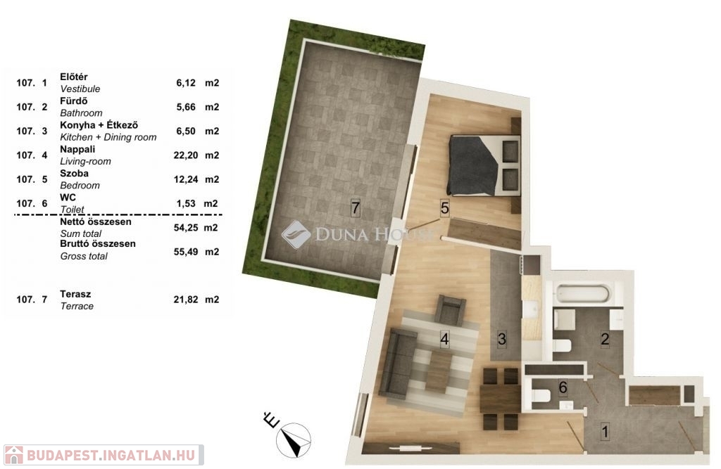 Kiváló elrendezésű lakás 54,25 m2 hasznos lakóterülettel és 21,82 m2-es terasszal.