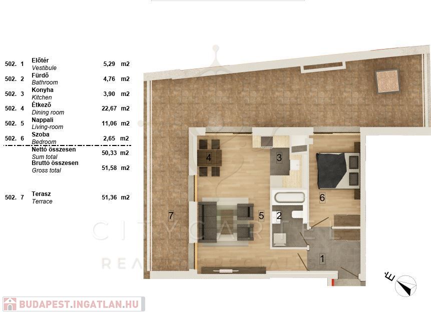 A liftes társasház 5. emeletén található, 60,57 nm-es, (50,3 nm lakás 51,36 nm terasszal) 2 szobás lakás korszerű hőszivattyús fűtés–hűtéssel és teljes körű okosotthon-rendszerrel felszerelve várja új tulajdonosát. A burkolatok még választhatók, így a leendő tulajdonos saját ízlésére szabhatja az ingatlant.