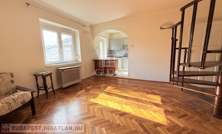 Titkos favorit a zavaros ingatlanpiac sokaságában, Zugló és Józsefváros határán a Puskás aréna mellett kiemelkedő infrastruktúrával. Ha szeretne központi elhelyezkedéssel egy kiváló, lakható, de akár könnyen bérbeadható társasházi lakást megfizethető áron akkor érdemes ezt az ingatlant személyesen is felfedeznie. Csupán 4 megállónyira (7perc metró) a Deák Ferenc tértől, Stadionok metró megállótól séta távolságban, madárcsicsergős, zöld és békés környezetben Stróbl Alajos utcában található az ingatlan. Elkerített zárt kertben áll az a 6 lakásos lépcsőház melyben a legfelső, második emeleten helyezkedik el ez a különleges, sallangoktól mentes duplex lakás. Az összes ablaka a csendes belső kert irányába néz és napkeltétől napnyugtáig világos, fényárban úszik. Az épület rendezett, a tetőt 10 éve újították fel új cserépfedést kapott, egyidejűleg velux ablakok kerültek beépítésre a felső szinten és az alsó szinten is műanyag ablakok váltották a fa nyílászárókat. Az alsó szinten az előszobából nyílik az összes helyiség, egy tágas háló, mellette egy praktikus kamra /dolgozó ablakkat és a fürő illetve a külön wc kapott helyet a konyha nappali mellett. A konyha – étkező és nappali jelenleg egy egység, de az ablakok elhelyezkedésének köszönhetően akár újra külön választhatóak. A nappaliból vezet fel egy csigalépcső, ahol további két hálószoba (ablakokkal)található, igény esetén a felső szint is alkalmas egy zuhanyzó és mosdó elhelyezésére. Az alső rész 47m2 a felső pedig bruttó 56m2 , a földhivatali nyilvántartás szerint 77m2, az értékesítési alapterületkén a 190cm alatti területet a szokásos 50%-kal került feltüntetésre. Fűtését tekintve jelenleg gázkonvektor, ami akár egy mika kazánra is cserélhető. Igény esetén a fűtés hőszivattyús klímákkal is megoldható opcionálisan H tarifával párosítva. A lakást immár 6 évig bérlő lakta, azonnal birtokba vehető az ingatlan. A környéken minden megtalálható, ami városi mindennapok kényelméhez elengedhetetlenek. Könnyen parkolhatóak a környező utcák, kiváló tömegközlekedési lehetőségek állnak rendelkezésre. Az aréna pláza csupán 900m távolságra. Tökéletes lehet akár nagyobb családok részére, de bérbeadás is korrekt hozamot hoz a stabil ingatlan ár növekedés mellett így magas inflációs környezetben értékálló befektetés.