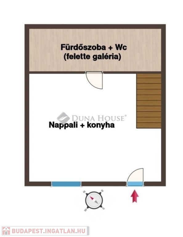 Az ingatlanba belépve a lakás legnagyobb, nappali + konyha funkciójú helyiségébe érkezünk meg. A helyiség jól berendezhető, egyedülállók, esetleg párok számára is megfelelő életteret kínál. A helyiségből egy fürőszoba + wc helyiség nyílik, melyben a fürdéshez kád is rendelkezésre áll. A fürdőszoba feletti rész, a lakás belmagasságának köszönhetően hálógalériaként funkcionál, így a lakás szeparált hálórésszel is rendelkezik.