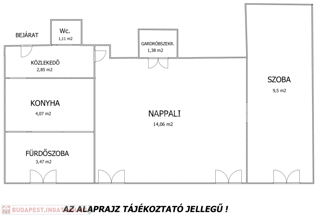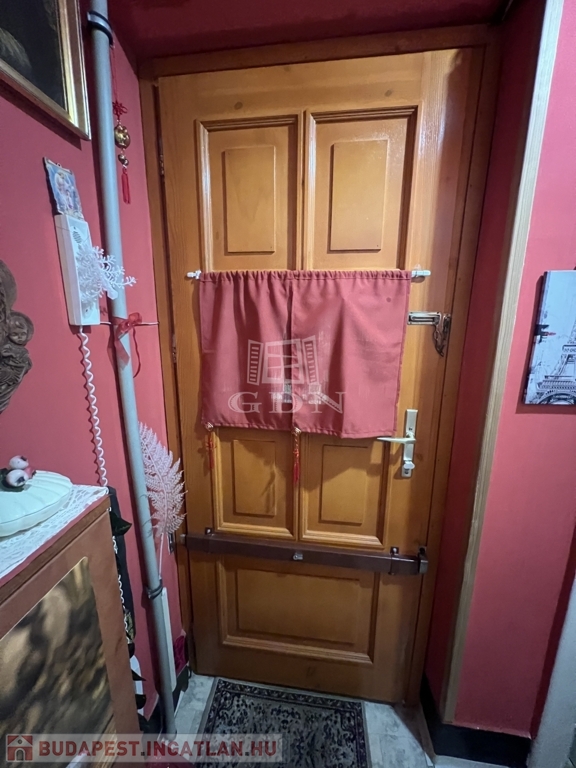 Méretek és a jelenlegi elrendezése az alaprajzon látható, tájolása D-Ny-i, belső parkra néz a lakás.
