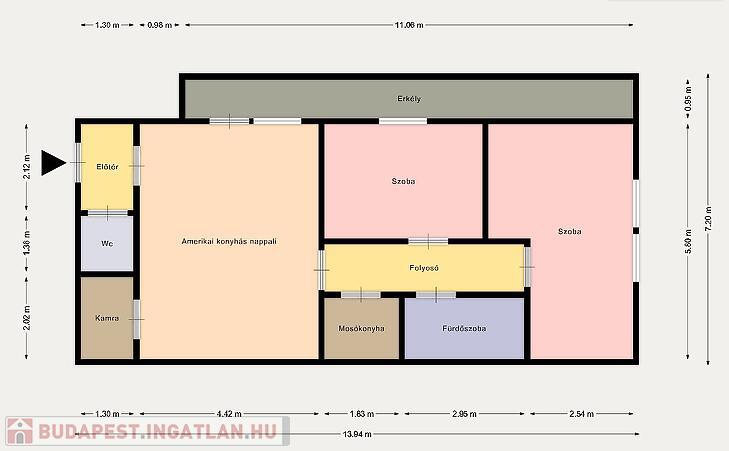 Elrendezése szerint 2 szoba, amerikai konyhás nappali, fürdőszoba mellékhelyiséggel, külön wc, kamra és mosókonyhából áll.