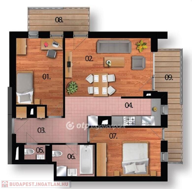 Lakások mérete: 43 nm-es, 1,5 szobás lakástól a 150 nm-es, 5 szobás és a tetőteraszos, exkluzív penthouseig.