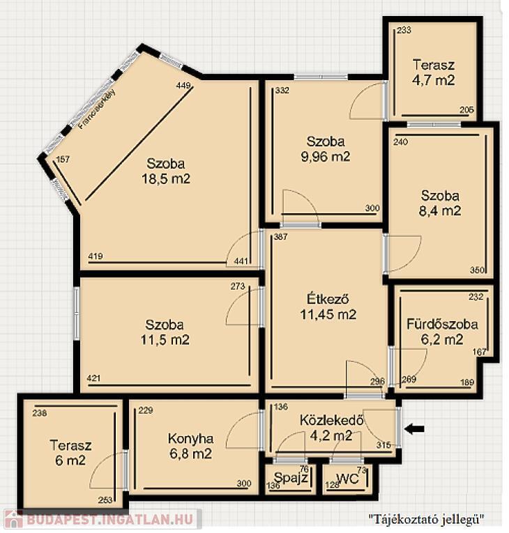 A lakásnak két terasza is van (6 nm, 5 nm). Az egyik terasz az utcai oldalra néz, míg a másik az oldalsó kertre.
