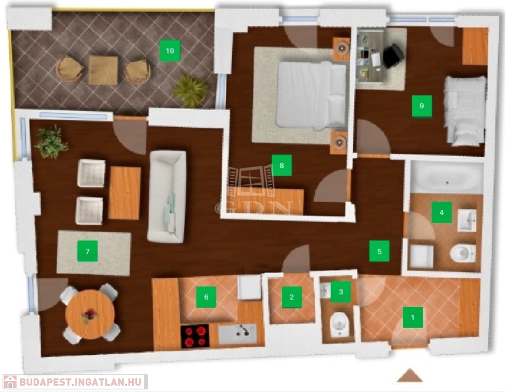 előtér(4.22m2), közlekedő(3.25m2), tároló(1,11m2), nappali(24.55m2), konyha(4.26m2), 2 szoba(12.67m2, 9.27m2), fürdőszoba+Wc(4.61m2), Wc(1.35m2), erkély(11m2).