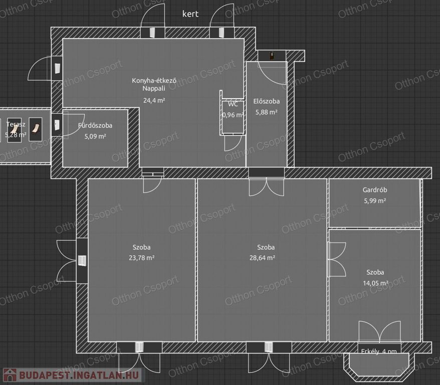 Előszoba, étkező konyhás nappali, plusz három szoba; ez utóbbi könnyen 3 és fél szobává alakítható, de átalakítással több lehetőségre is van mód. Belmagasság 3,10 m.