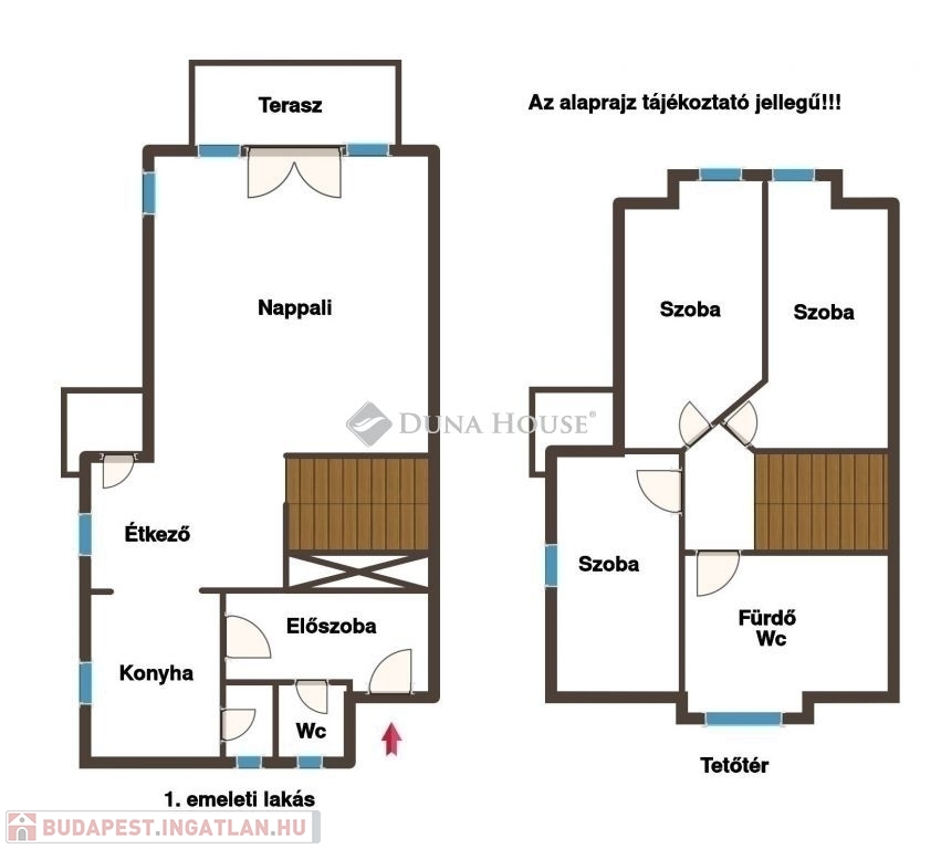 Alsó szinten amerikai konyhás nappali, étkezővel és terasszal, illetve egy wc, emeleten 3 szoba és a fürdőszoba található.