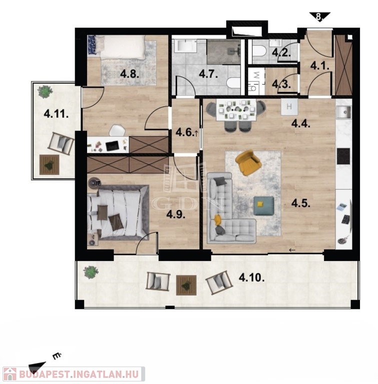 49, 54, 71, 80 nm2 méretű ingatlanok közül lehet választani. Földszinti lakások saját terasszal és kertrésszel míg az 1. és 2. emeleti lakások nagy teraszokkal rendelkeznek.
