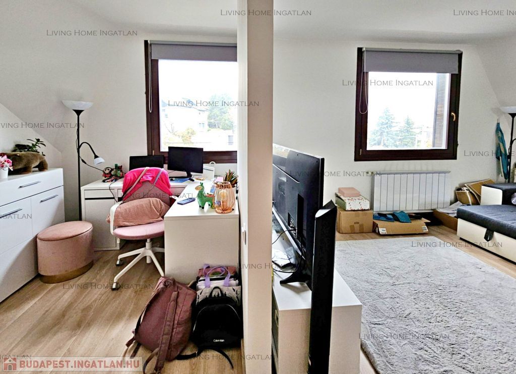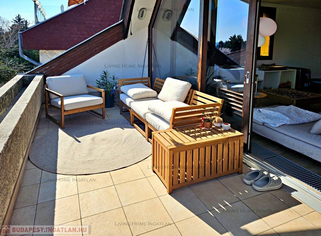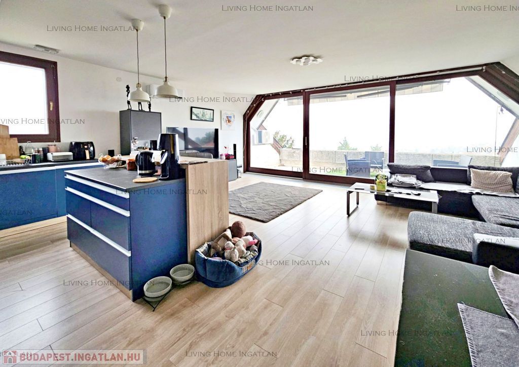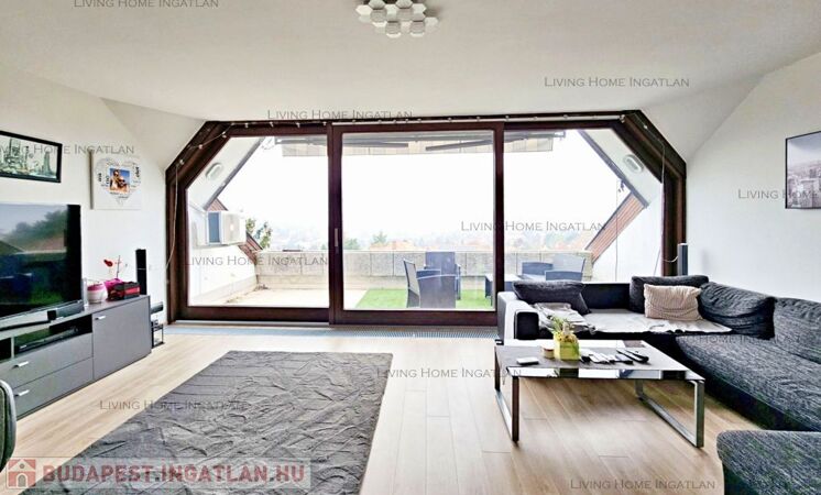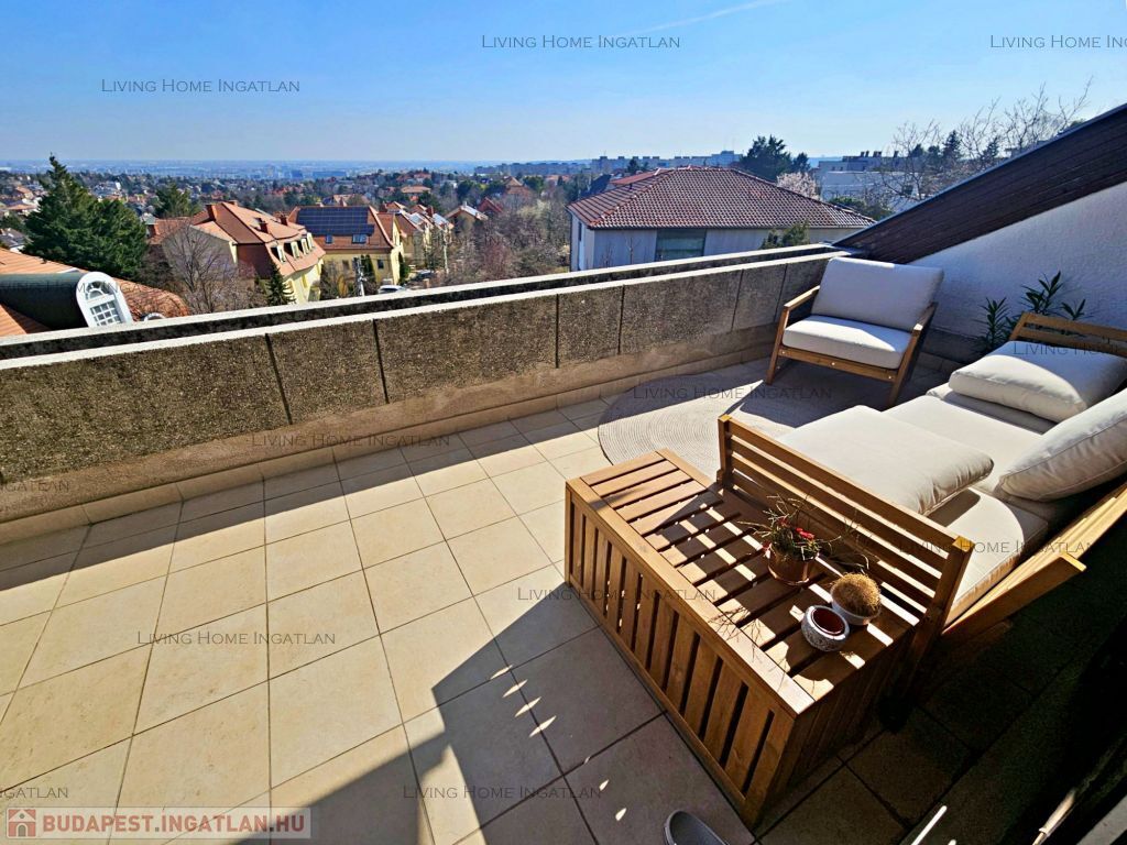 Sasad tetején, kertes társasházban kínálunk eladásra egy 94 nm-es, második emeleti, kétszintes, amerikai konyhás nappali + 2 hálós, dupla komfortos, nagy teraszos, tágas lakást pazar panorámával.