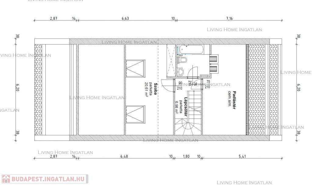 Emelet: Nagy hálószoba, fürdőszoba, méretes tároló a padlástérben.