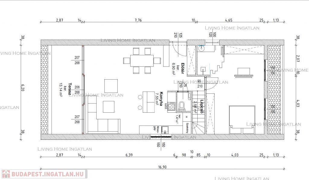 Alsó szint: előszoba, amerikai konyhás nappali, háló, fürdőszoba, külön WC.