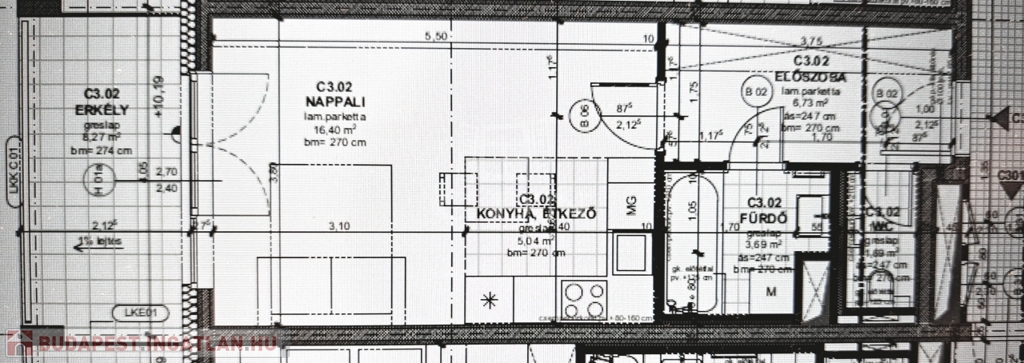 A hirdetésben szereplő lakás 33,55 m²-es, 1 szobás,3. emeleti, és tartozik hozzá egy 8,27 m²-es erkély is.
