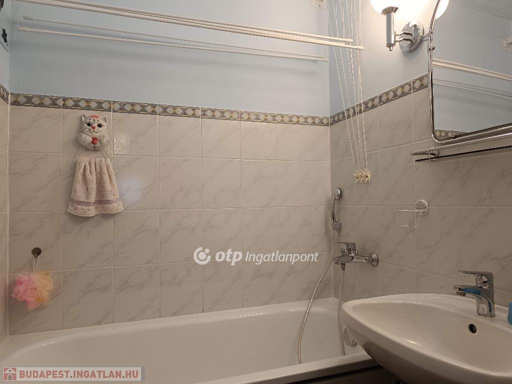 Balra található egy praktikus gardrób, benne beépített szekrényekkel, mellette különálló felújított fürdőszoba káddal, valamint külön WC.