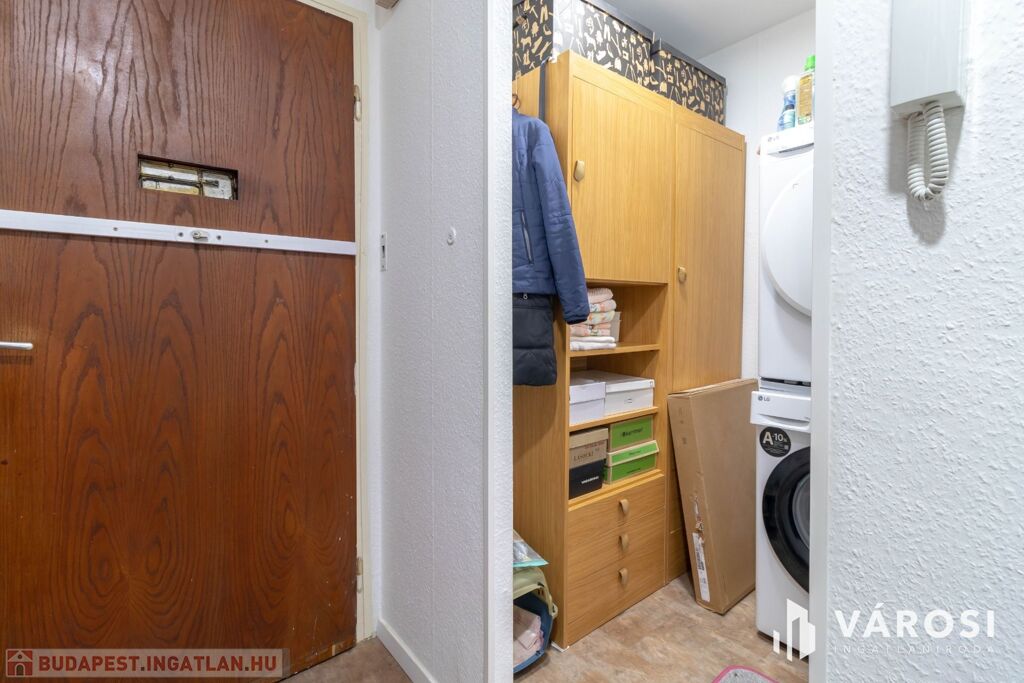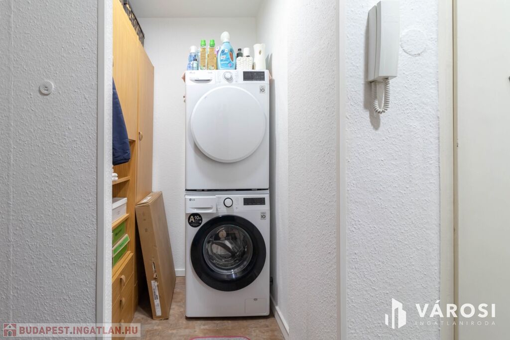 A bejárat melletti gardróbban – ahogy a fotókon látható – mosógéphez, szárítógéphez kialakított vizes csatlakozás érhető el.