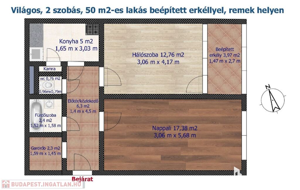 A fürdőszoba mellett külön wc helyiség, a konyhából pedig egy paraktikus kis kamra nyílik.