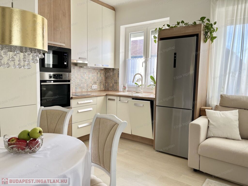 modern gépesített konyhával, ízlésesen berendezett lakás.