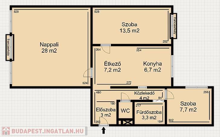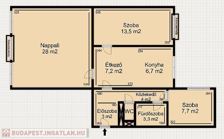 Az ingatlanban egy hatalmas 28 nm-es, franciaerkélyes nappali található, illetve egy 13,5 nm-es szoba és egy 7,7 nm-es félszoba. Az étkezőt és a konyhát jelenleg egy konyhabútor szeparálja el, de igény szerint a két helységet tovább lehet nyitni a nagyobb térérzet érdekében. Fürdő és WC külön került kialakításra. Sajátossága a lakásnak, hogy az alapvetően sötétebb közlekedő folyosó falán itt egy „ablakot” helyeztek el, amelyen keresztül fény áramlik be, így világosabb érzetet kelt, mint a többi hasonló elosztású ingatlan.